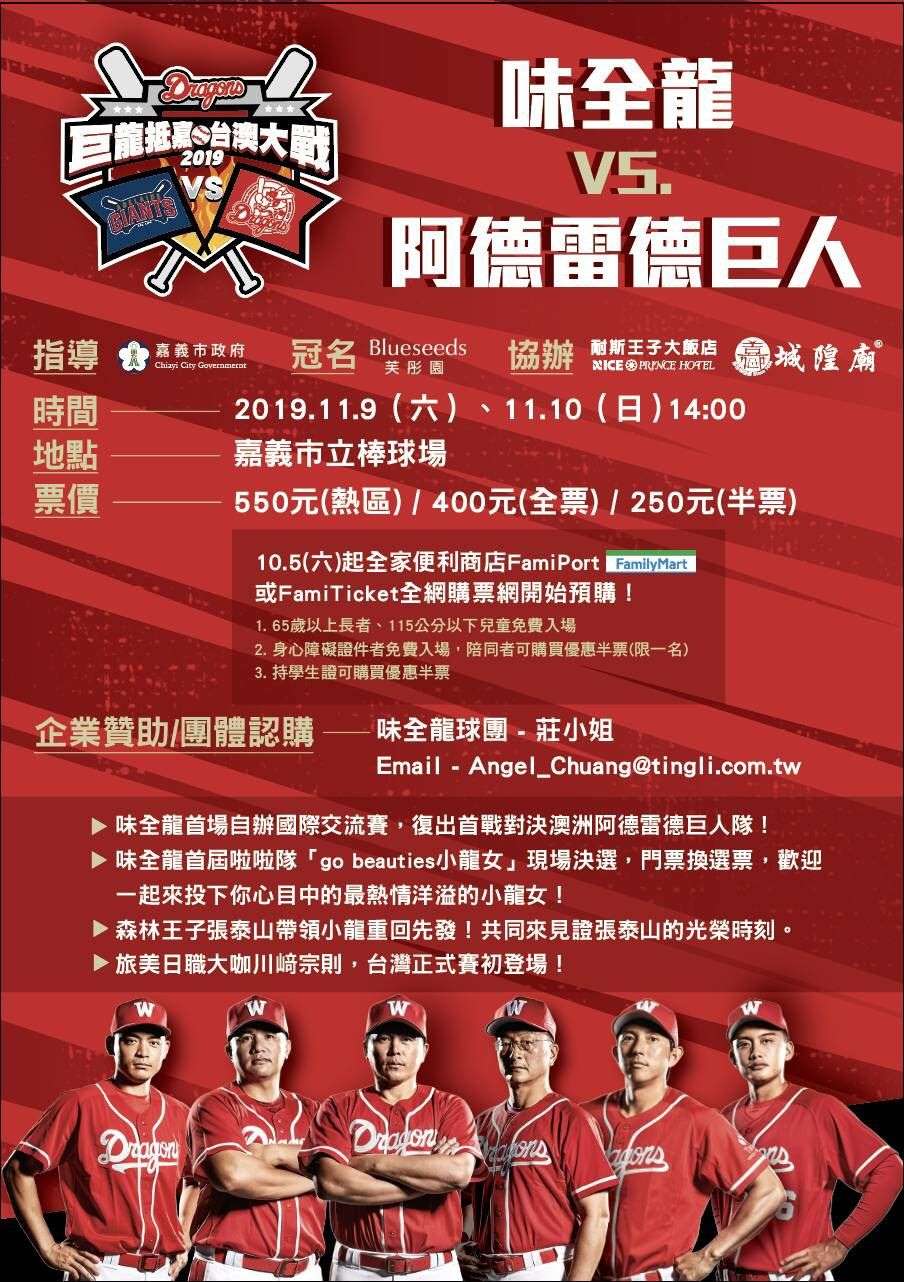 主旨:味全龍辦理「巨龍抵嘉 台澳大戰」,請鼓勵所屬踴躍參與,請查照。