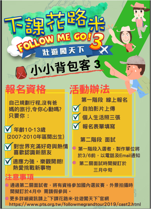 四、報名時間為2020年1月20日至2020年2月20日止。詳細內容及辦法請上臉書搜尋『下課花路米』粉絲團,或參考節目官網:https://www.pts.org.tw/followmegrandtour2019/ 。