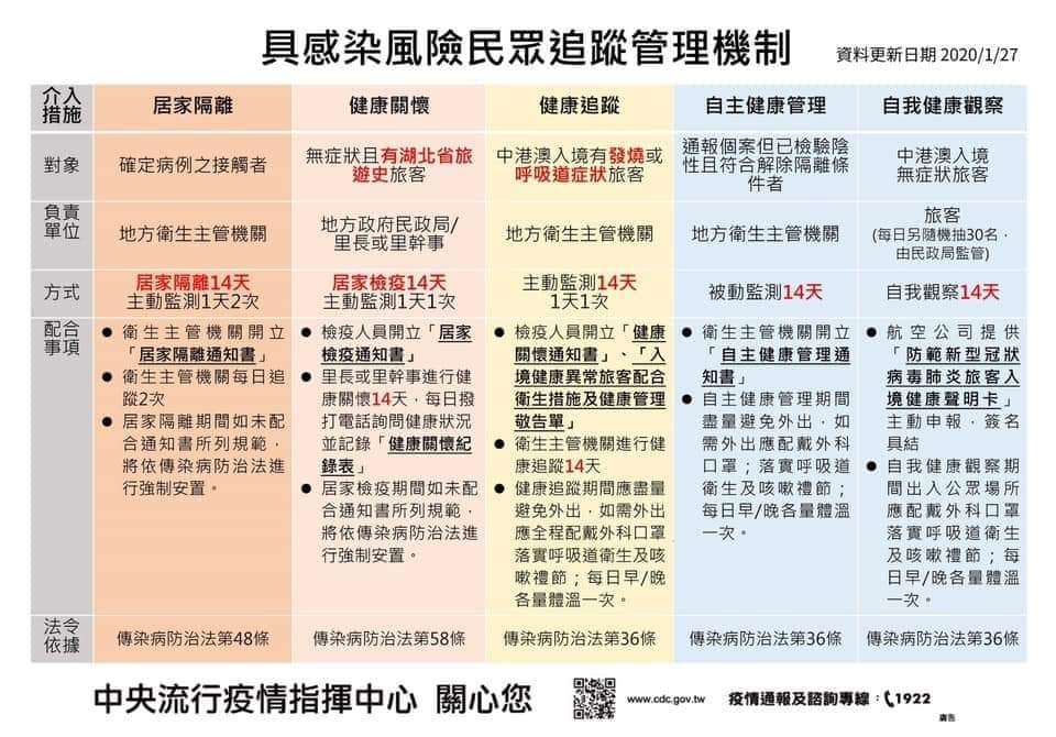 1.自湖北、廣東、溫州、杭州地區返台者,請務必確實居家檢疫14天,如出現發燒或類流感症狀,請撥打防疫專線1922,並戴上口罩儘快就醫,就醫時應告知旅遊史、接觸史及不適症狀等,若為武漢肺炎疑似得病或確診者,須依法於24小時內完成通報。