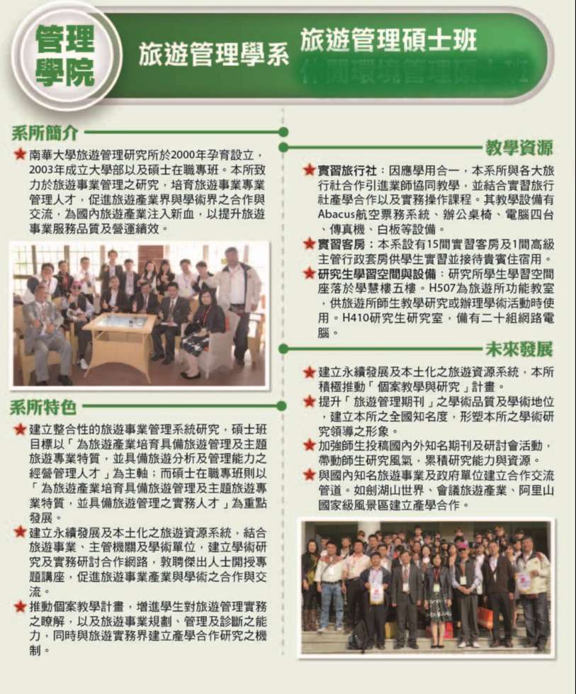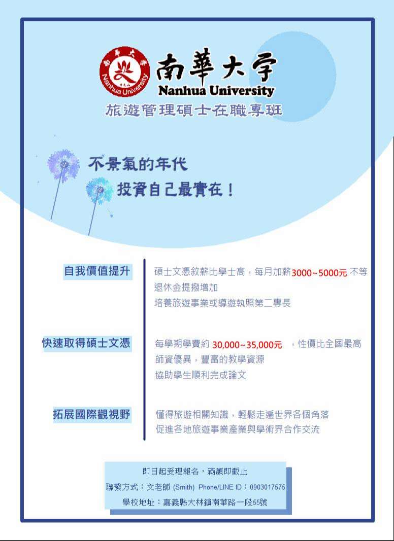 南華大學109學年度第一學期旅遊管理學系旅遊管理推廣教育碩士學分班招生簡章