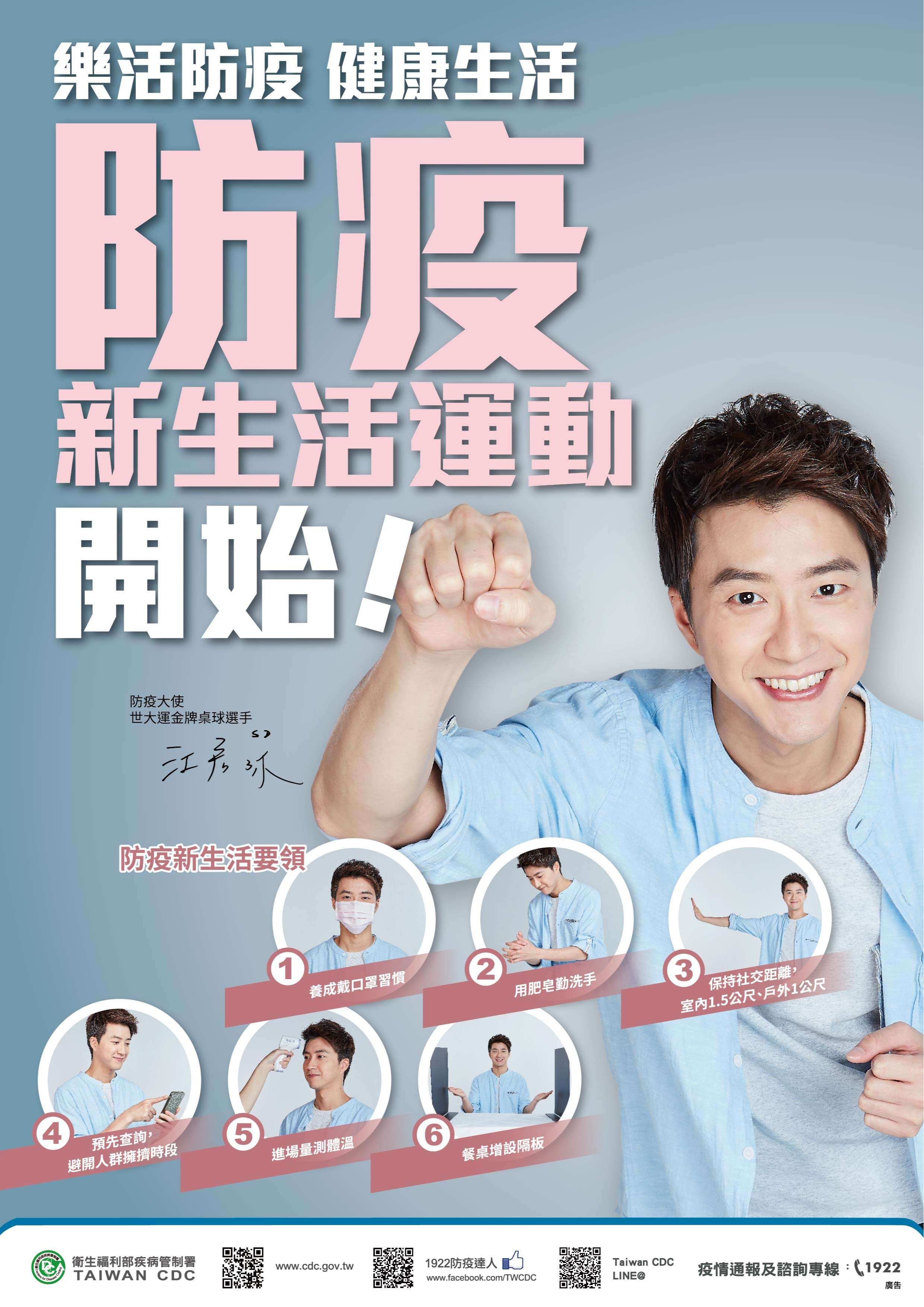 為推廣防疫新生活運動,嚴重特殊傳染性肺炎中央流行疫情指揮中心已製作「樂活防疫·健康生活」之60秒電視宣導短片及海報。