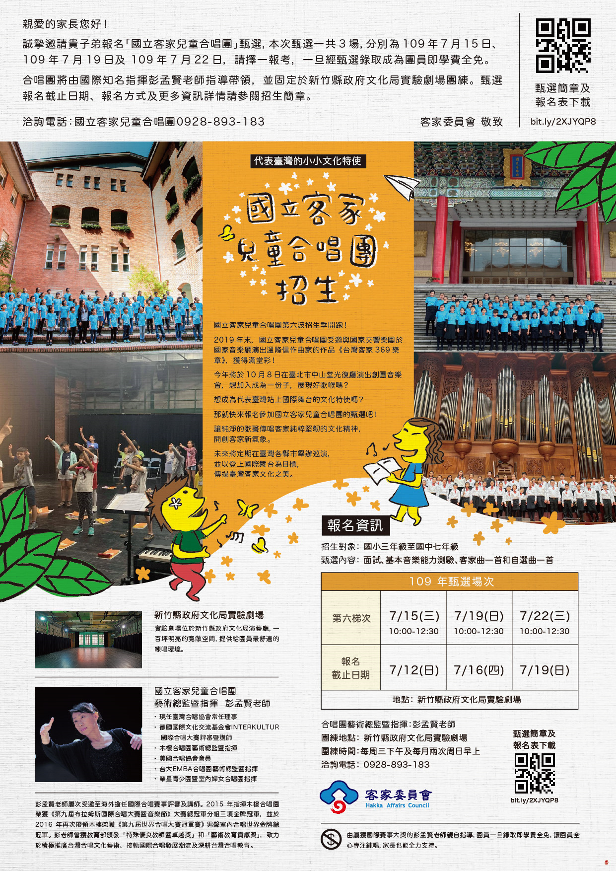 轉知客家委員會辦理「國立客家兒童合唱團」109年度第2次團員甄選招生資訊1份(如附件),鼓勵有興趣的學生報名參加。