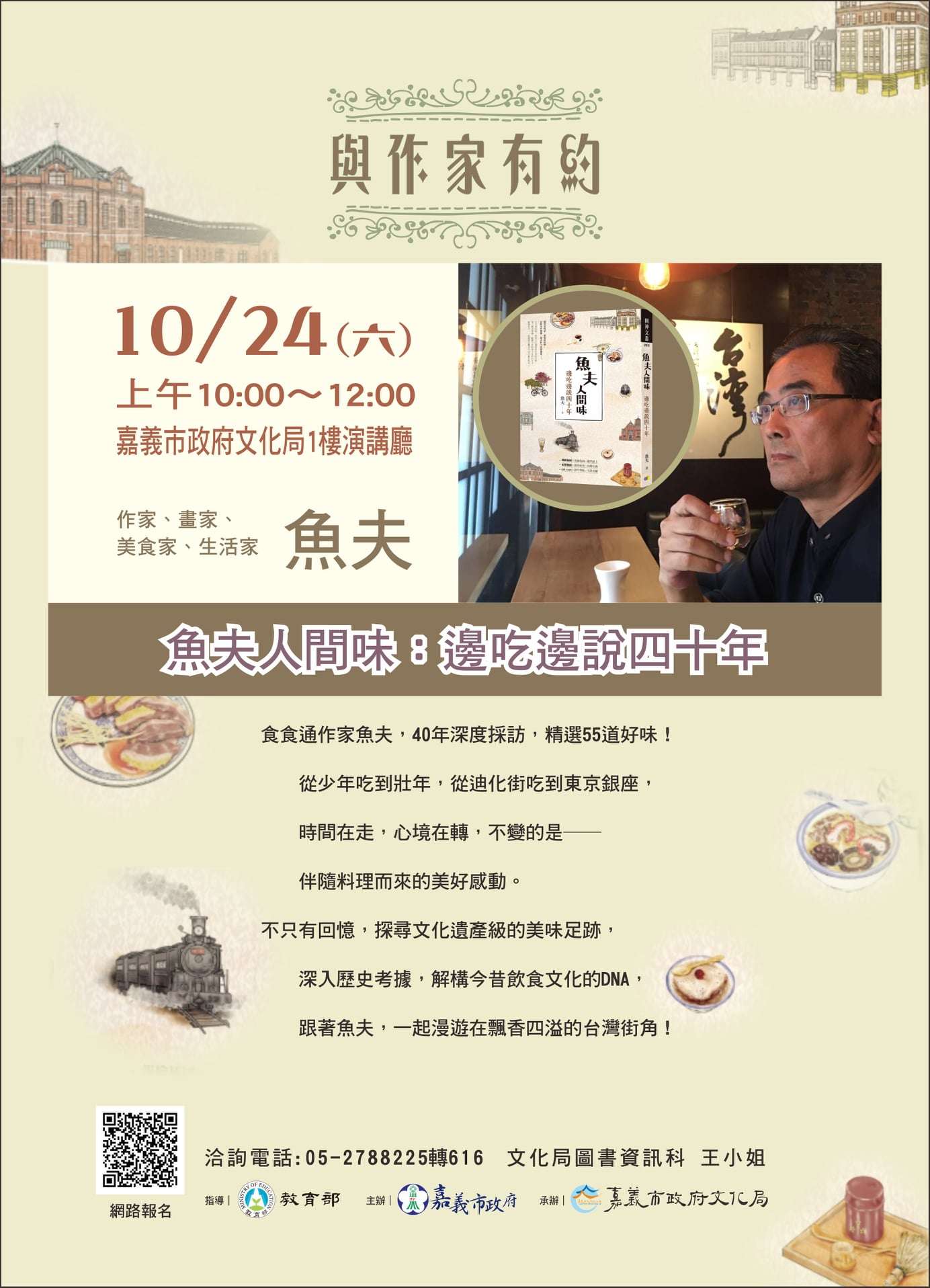 一、為提升市府同仁及市民生活文學素養,特邀請魚夫主講「魚夫人間味:邊吃邊說四十年」,以及前農委會主委陳武雄先生主講「禪與詩」。