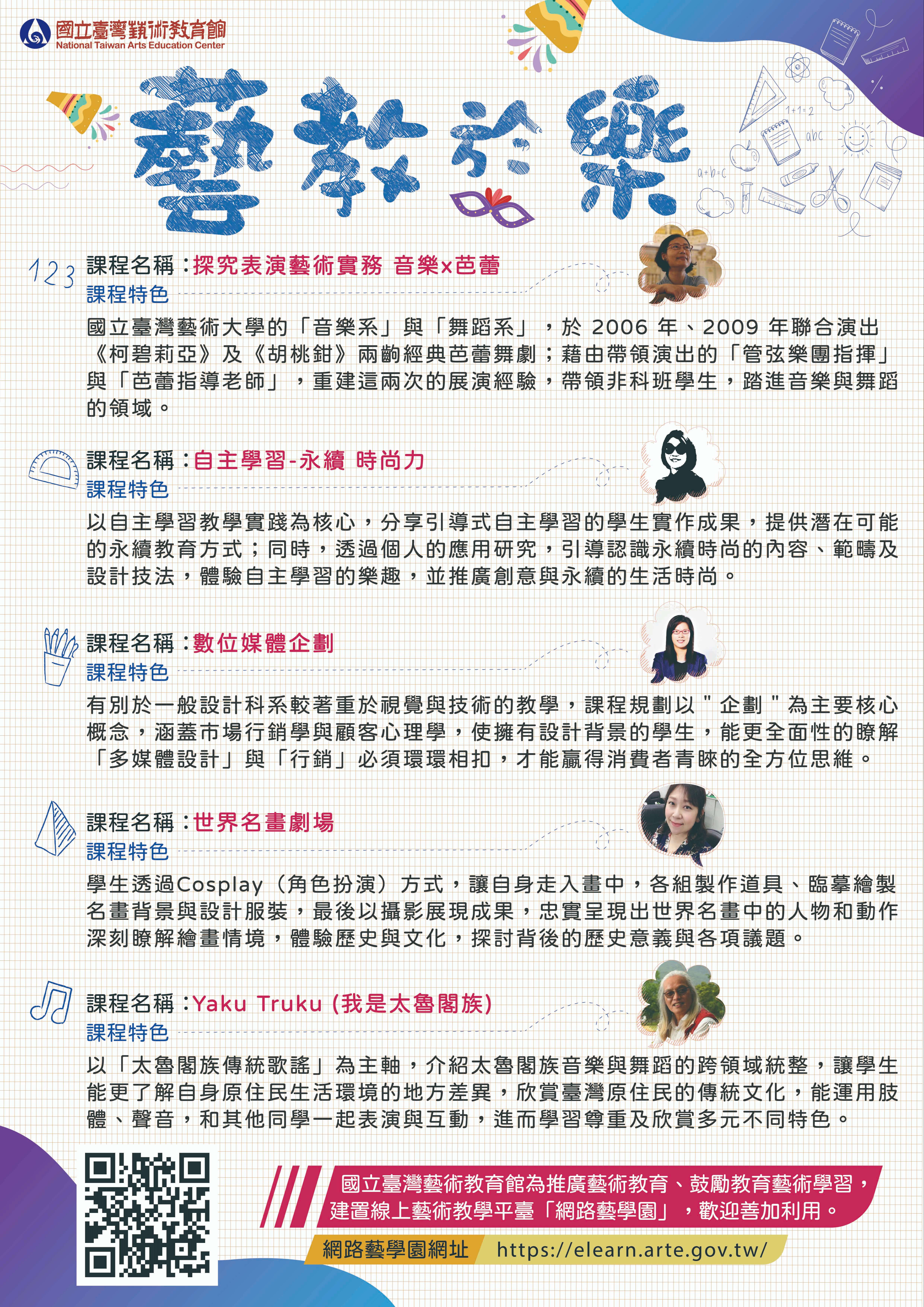 四、該館不定期舉辦「網路藝學園」課程推廣活動,歡迎關注臉書粉專訊息(https://www.facebook.com/ntaec/)。