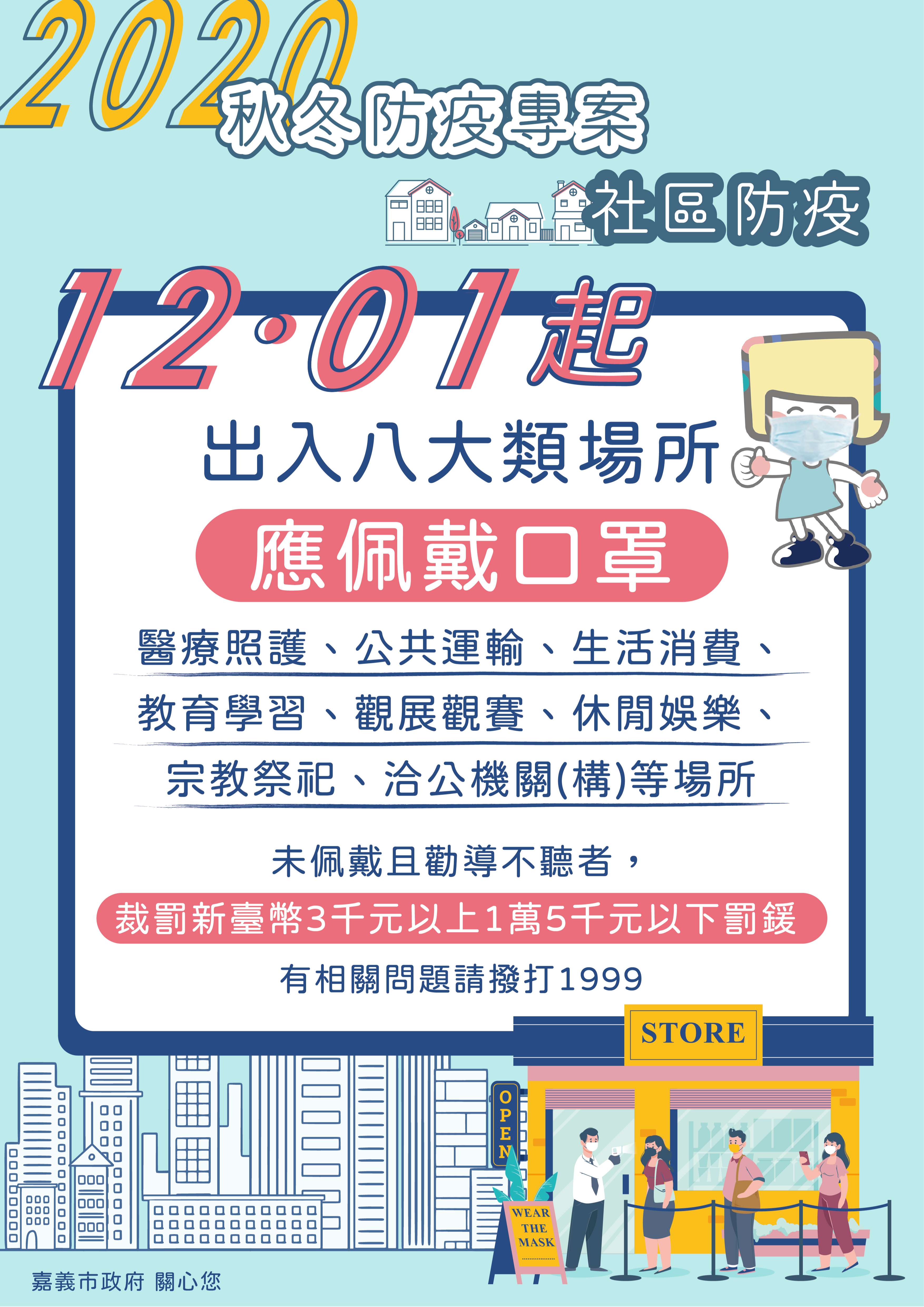 一、因應國外疫情升溫,境外移入個案增加,提高國內感染風險,中央流行疫情指揮中心爰自109年12月1日起實施秋冬防疫專案,民眾進入八大類高感染傳播風險場域,須強制佩戴口罩,以嚴守社區防線。
