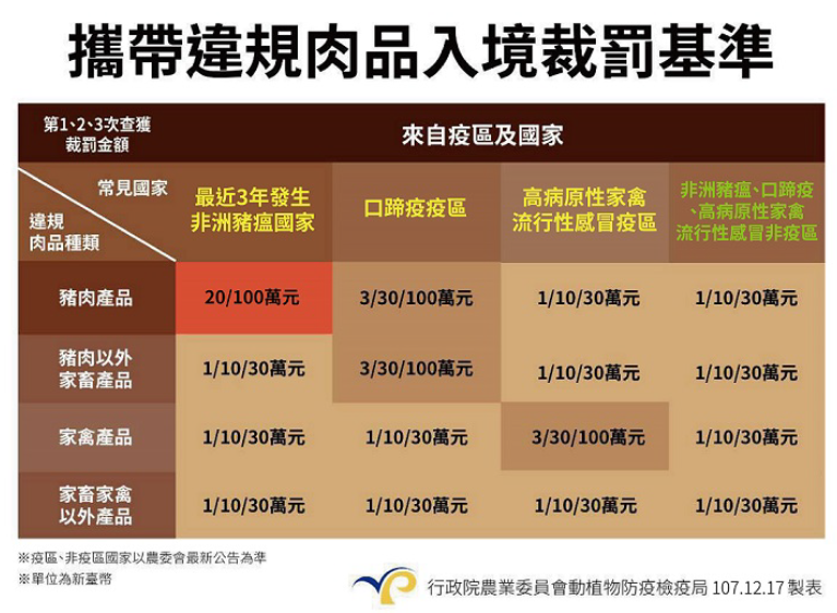 二、依據「動物傳染病防治條例」第45條之1規定及防檢局107年12月18日公告裁罰基準(如附件),旅客違規攜帶動物產品入境者處新臺幣(以下同)1萬元以上100萬元以下罰鍰,旅客如自3年內有發生非洲豬瘟國家違規攜帶豬肉產品入境者第1次處新臺幣20萬元、第2次處100萬元罰鍰;外籍人士不具居留證,第1次受罰20萬元罰鍰且未能立即繳清者,拒絕其入境。