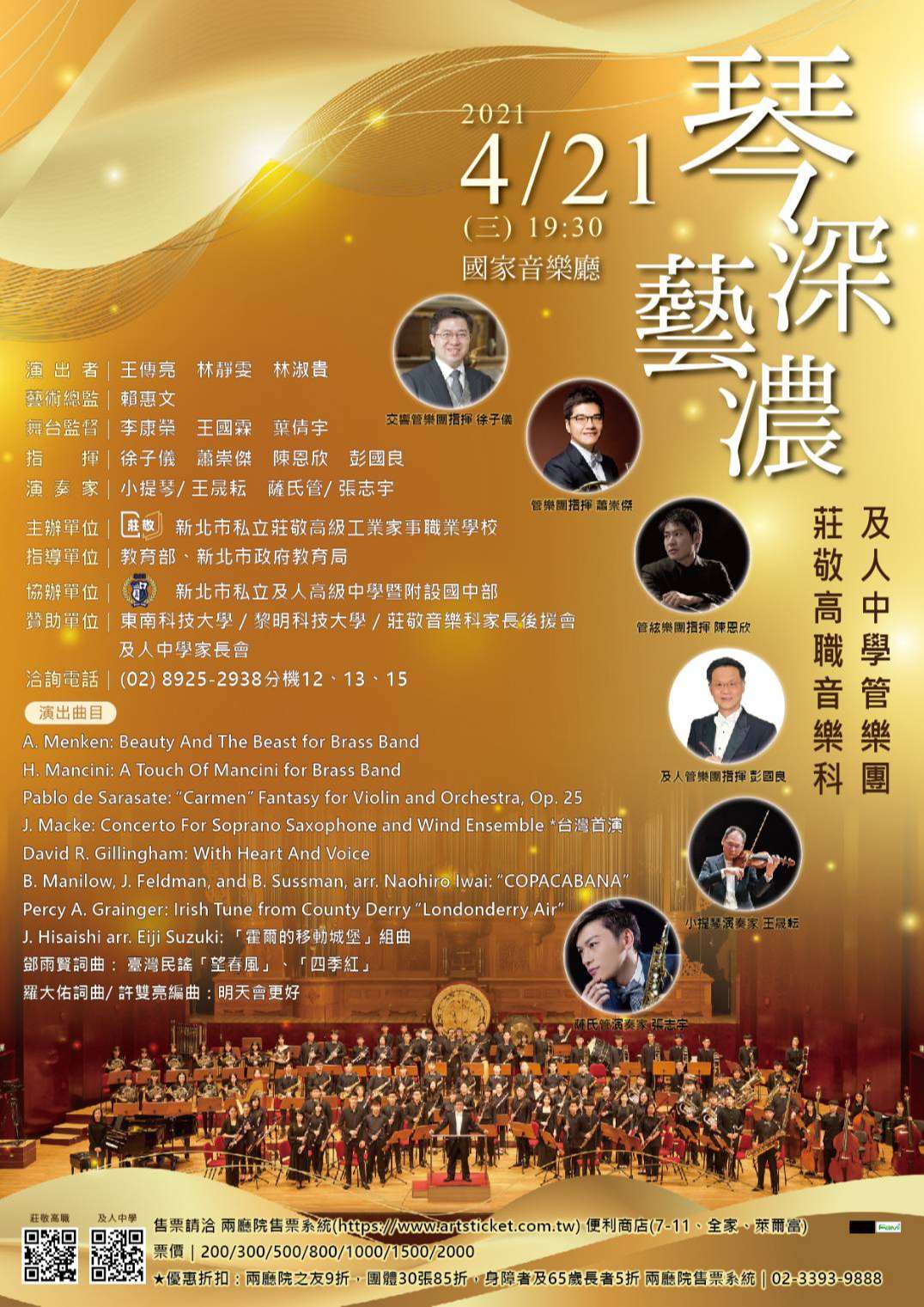一、新北市私立及人高級中學管樂團,定110年4月21日於國家音樂廳舉辦「琴深藝濃」音樂會,檢送活動海報電子檔,請惠予公告。