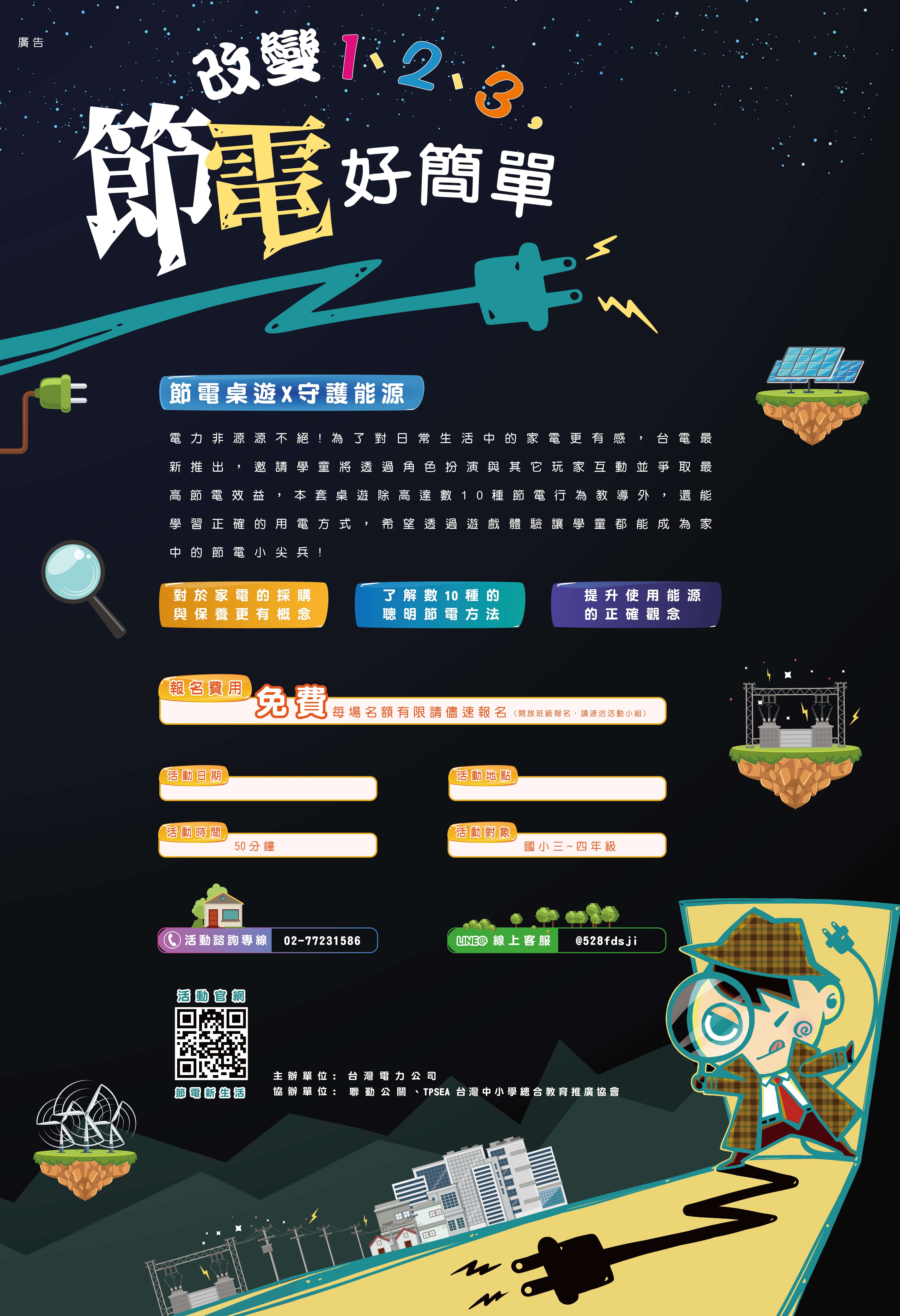 二、為提升全民節電意識,並使節電教育能向下扎根,該公司積極推動旨述計畫,主題為「改變123,節電好簡單」,對