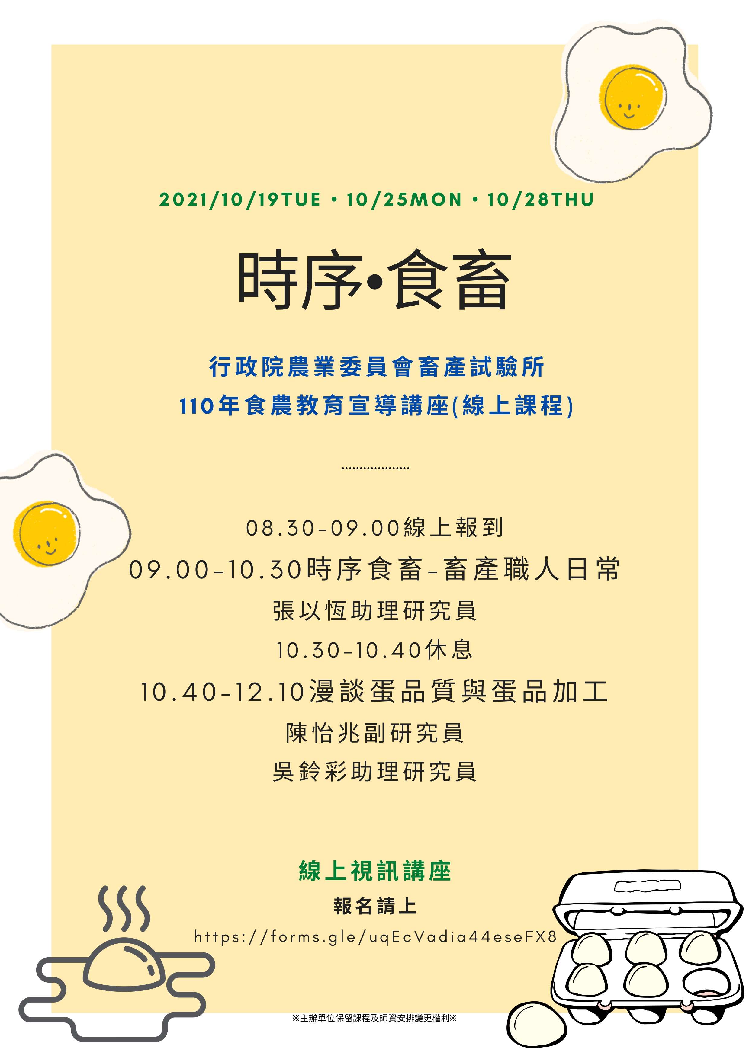 10月19日、10月25日及10月28日,舉辦三梯次「時序.食畜」線上食農教育宣導講座,詳細課程資訊如附件。