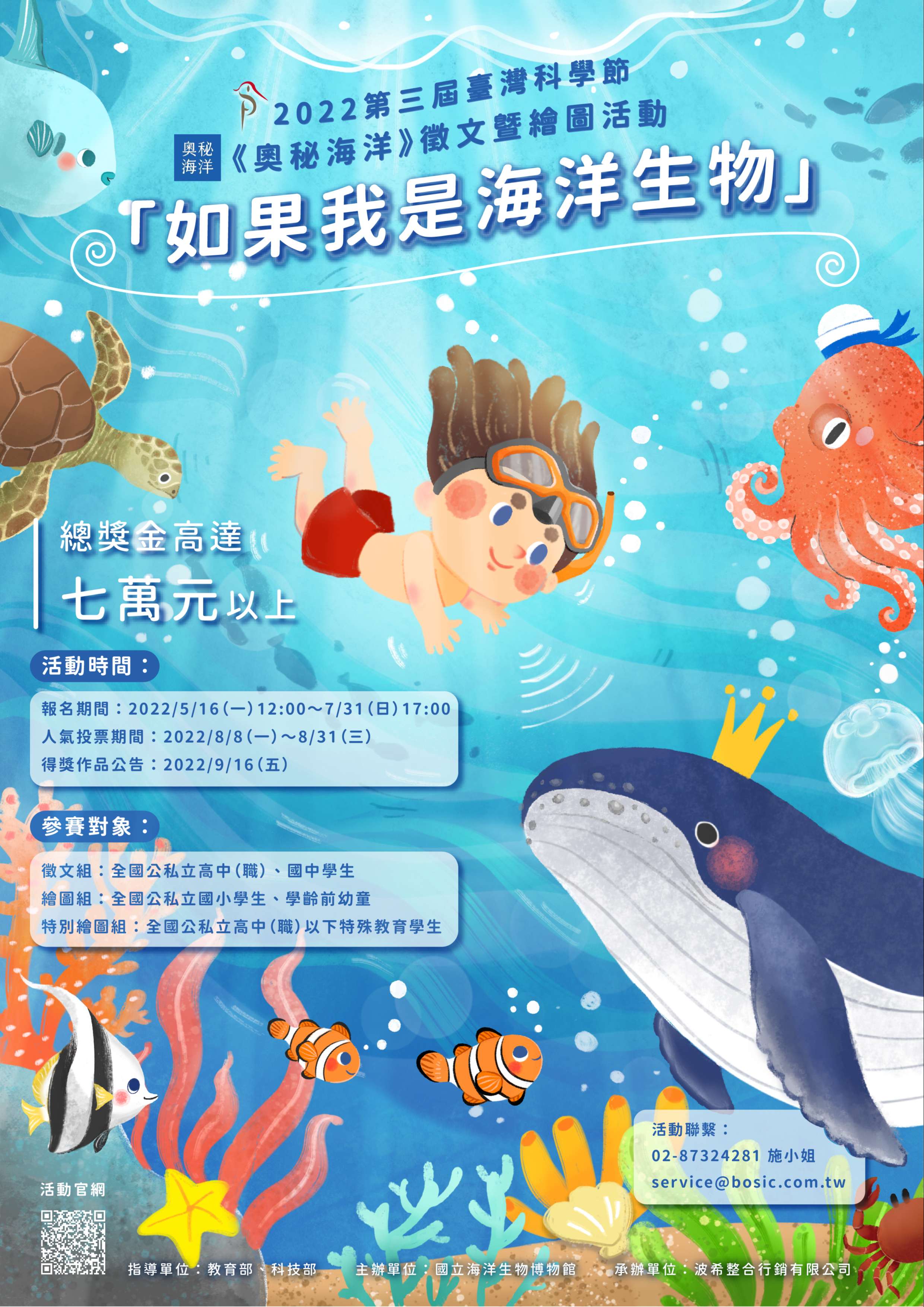 主旨:檢送國立海洋生物博物館「2022第三屆臺灣科學節《奧秘海洋》徵文暨繪圖活動」資訊,請老師鼓勵學生踴躍參與。