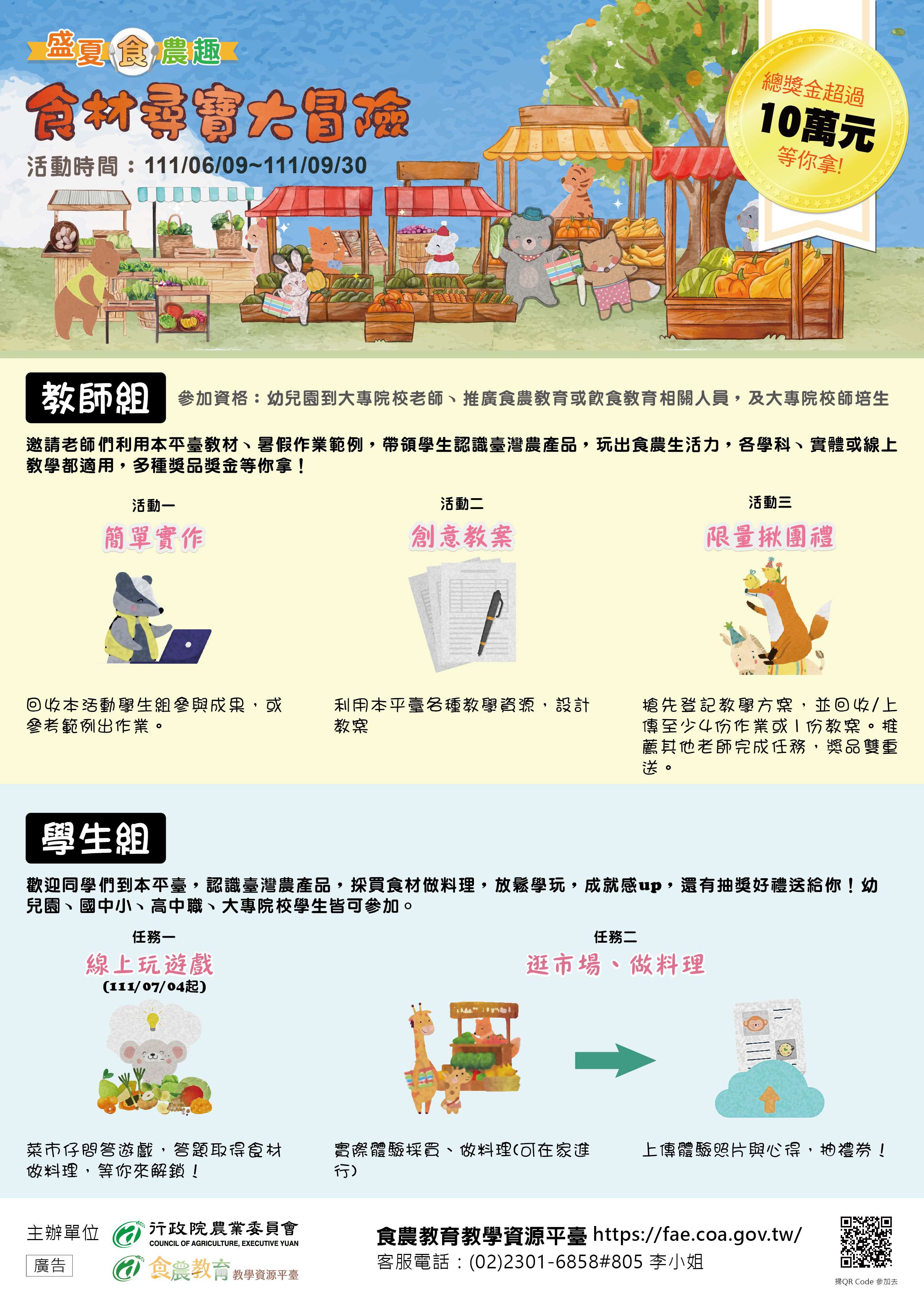 主旨:行政院農業委員會食農教育教學資源平臺訂於111年6月9日至9月30日辦理「盛夏食農趣:食材尋寶大冒險」活