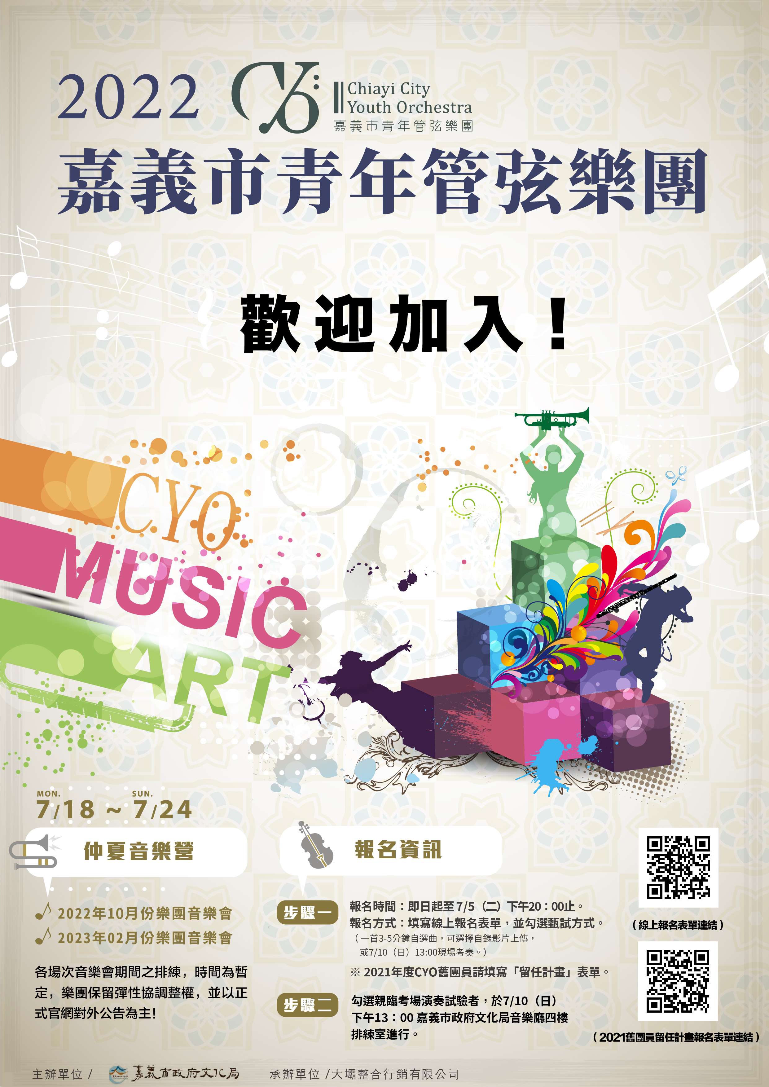 一、「2022嘉義市青年管弦樂團《仲夏音樂營》暨《年度音樂會系列》」活動將於7月18日登場,即日起開放報名,歡迎嘉義市青年學子踴躍參加。