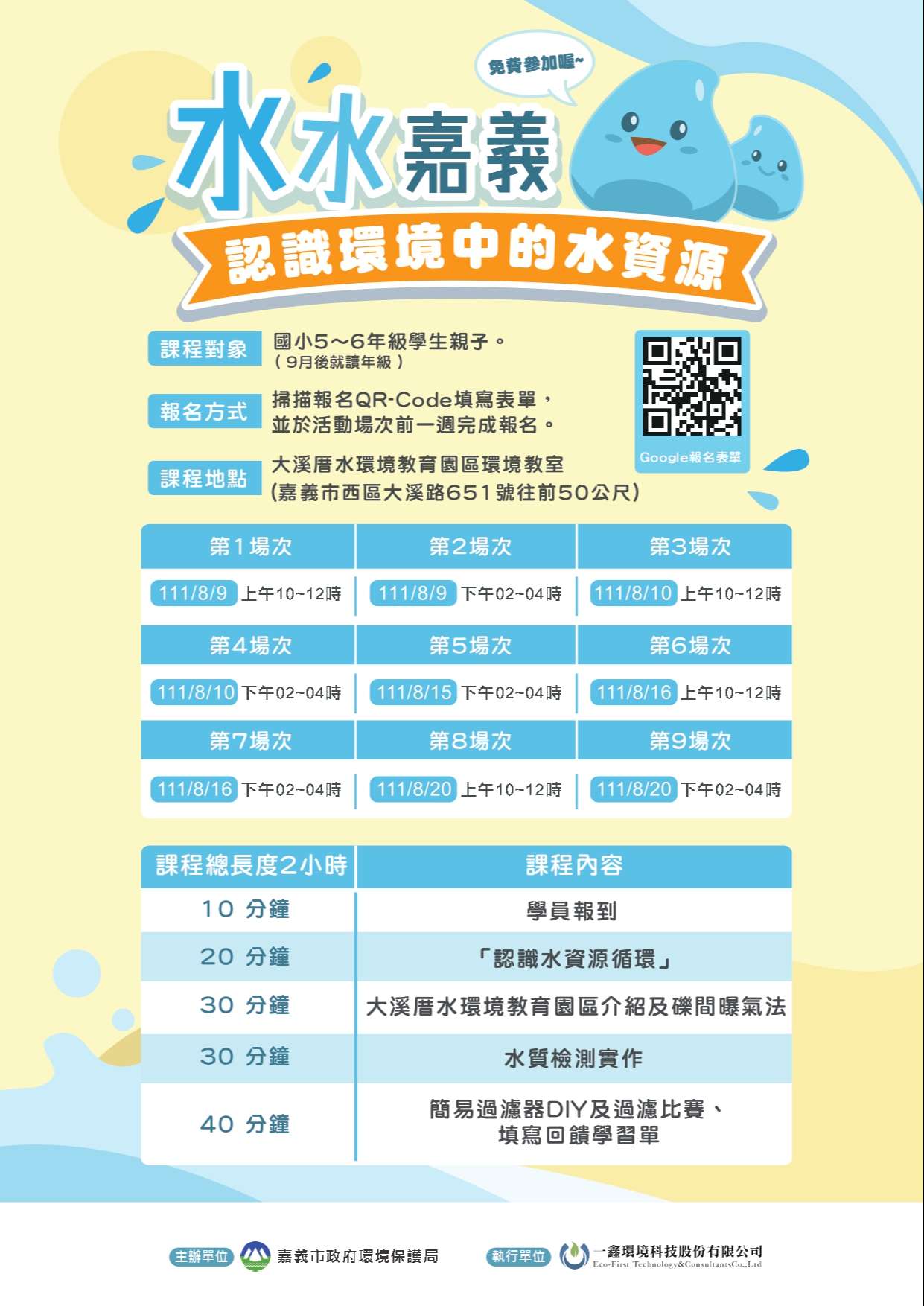 主旨:檢送本局111年8月9日至20日辦理9場次「水水嘉義認識環境中的水資源」環境教育課程報名資訊,敬請廣為宣傳周