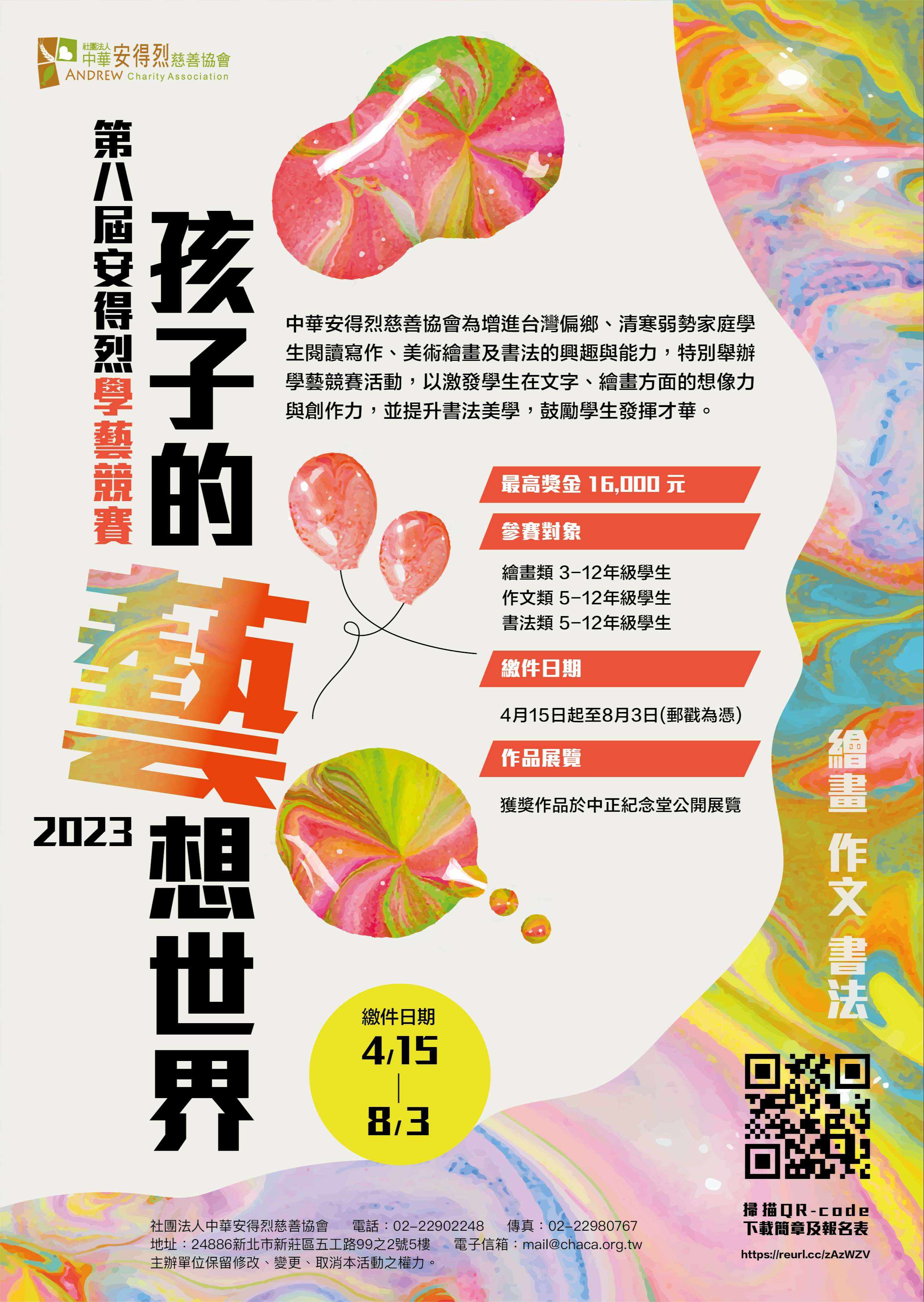 一、本會為增進台灣偏鄉、清寒弱勢家庭學生閱讀寫作、美術繪畫及書法的興趣與能力,特別舉辦學藝競賽活動,以激發學生在文字、繪畫方面的想像力與創作力,並提升書法美學,鼓勵學生發揮才華。