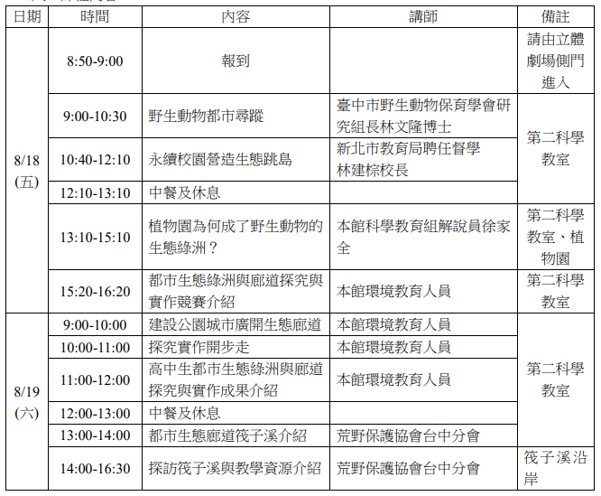 六、費用:參與本次各階段的課程皆為免費,並於研習結束後,以實際參與時數 核發教師研習時數及環境教育時數。