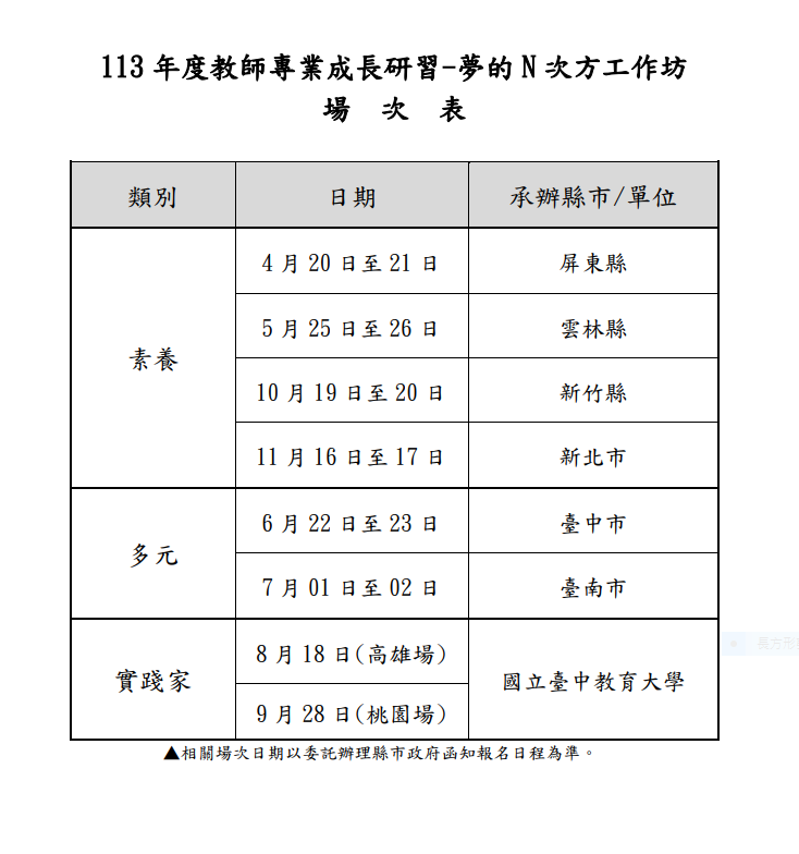 二、為鼓勵教師持續精進課程教學,推動新課綱並實踐應用於教學,提供教師教學支持,國教署113年規劃素養、多元、實踐家等類別共8場工作坊;因屏東及臺中場次辦理時程異動,爰請貴校協助轉知所屬教師。