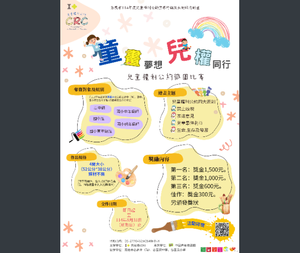 二、為了讓兒童及少年、照顧者、社會大眾認識兒童權利公 約,進而關心與實踐兒童及少年相關權益,並鼓勵兒童及 少年參與宣導活動之規劃、設計與執行,本府委託中國青 年救國團辦理旨揭徵圖比賽,使兒童及少年藉由繪畫表達 他們對兒童權利公約的認識與理解,並將這些抽象的概念 具象化,據以研發適合不同年齡層之宣導文宣。