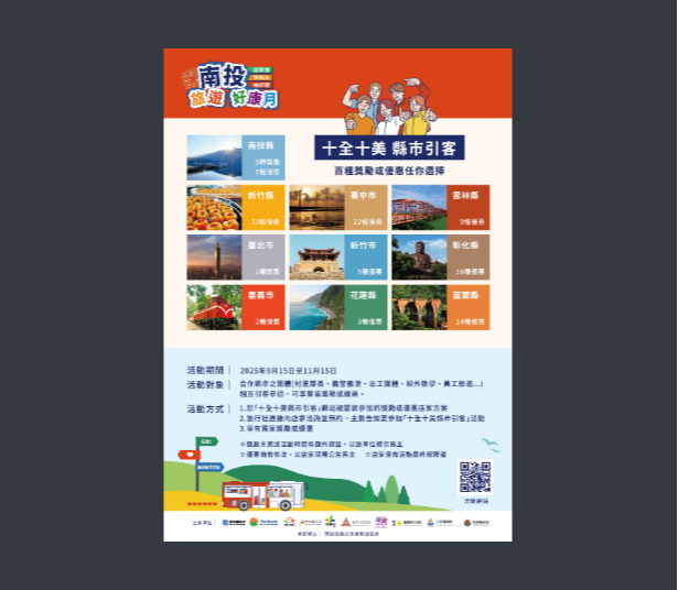 二、另南投縣政府轉知,凡蒞臨合作縣市辦理參訪活動者,得 享有免費票券、專屬優惠等獎勵措施,各縣市彙整方案高 達116種,歡迎多加利用。詳細內容及申辦方式請至十全十 美縣市引客網站查詢https://www.10citygo.com。