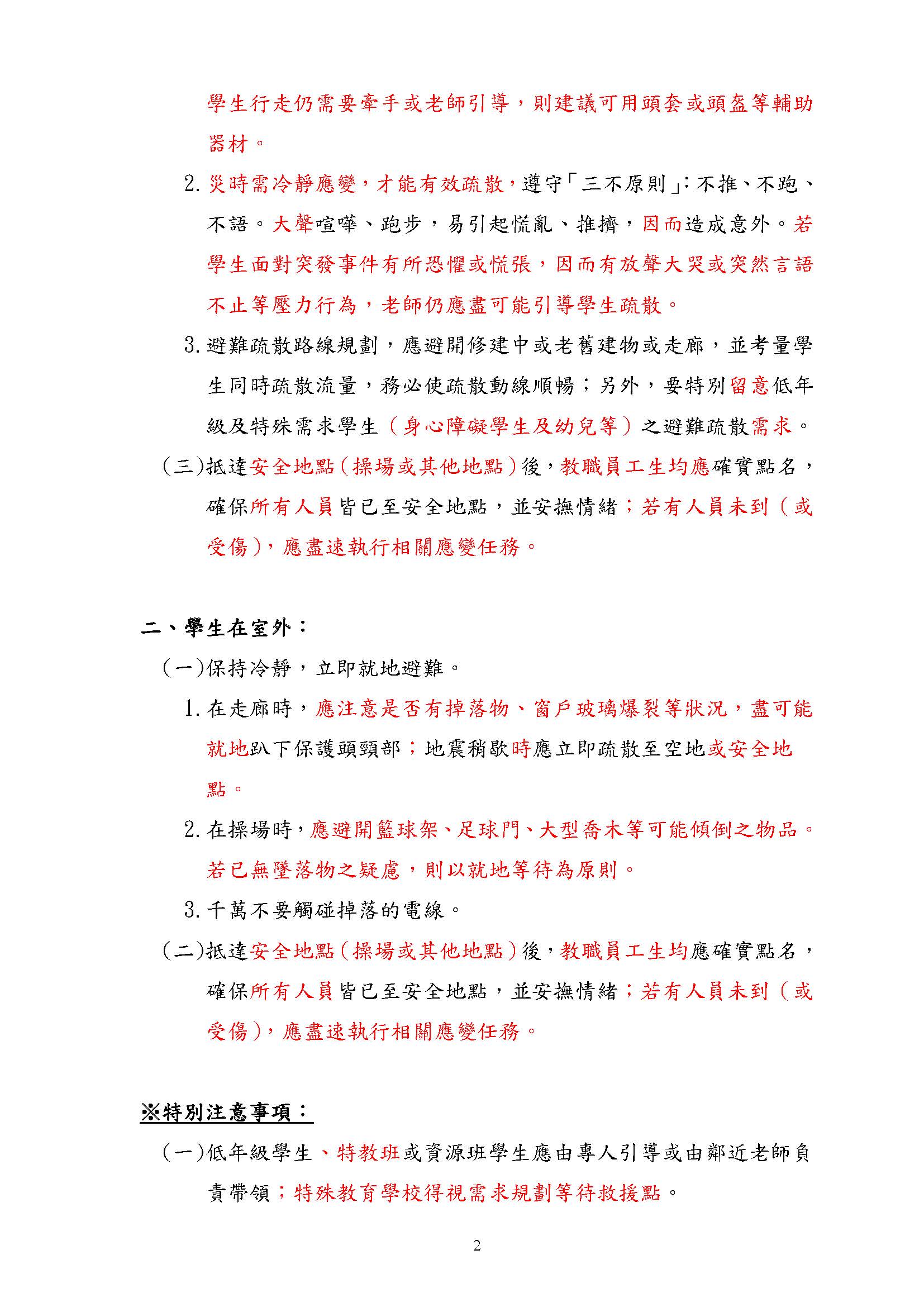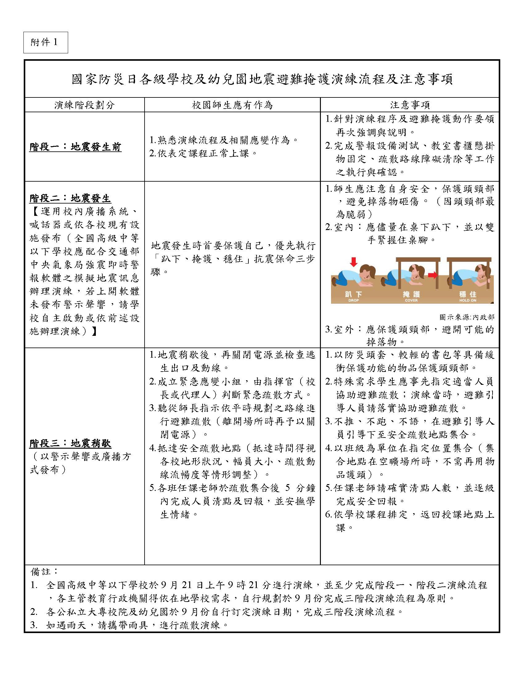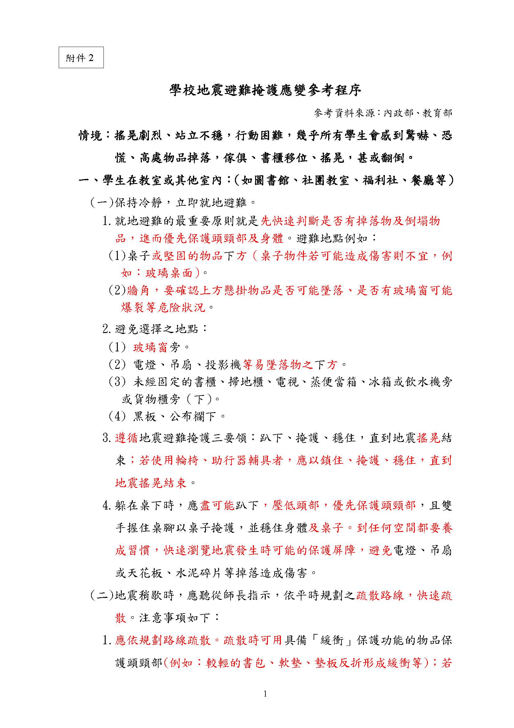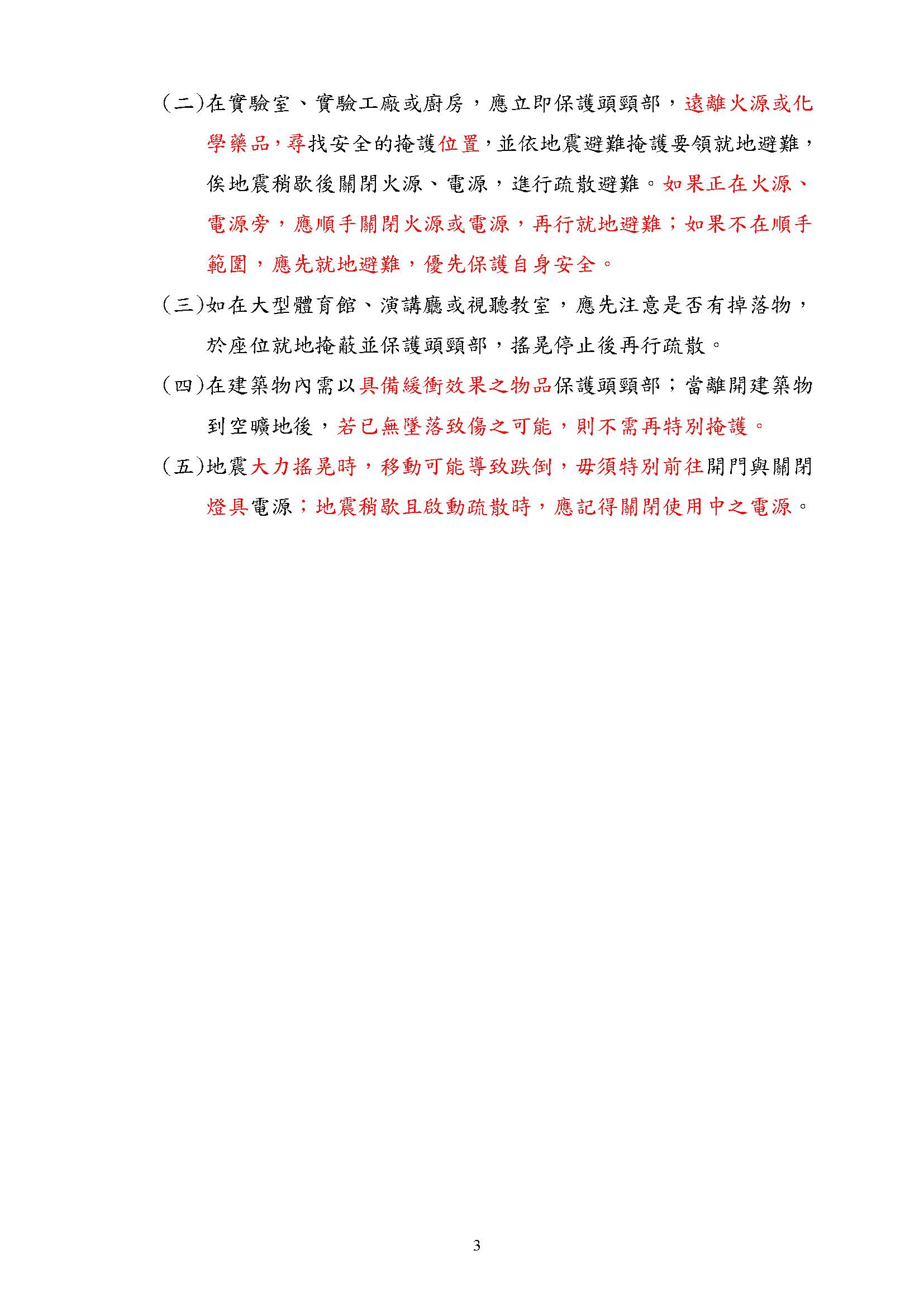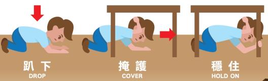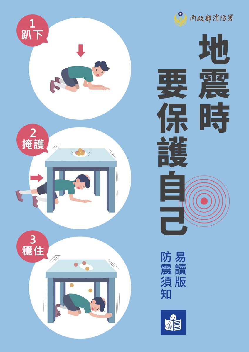 地震發生時首要保護自己, 優先執行 「趴下 、掩護 、穩住」抗震保命三步驟 。易讀版防震須知如附件,請下載參閱。